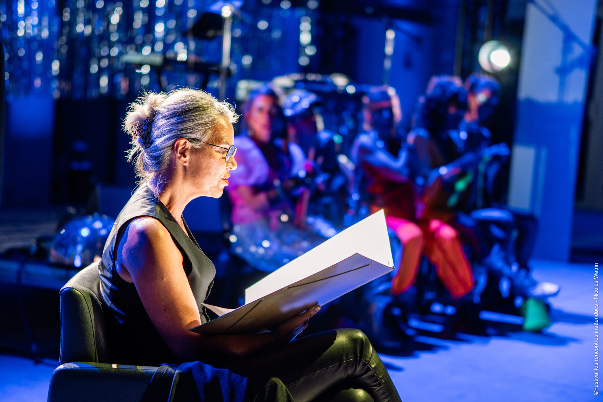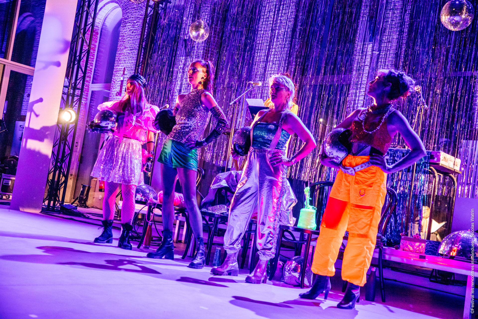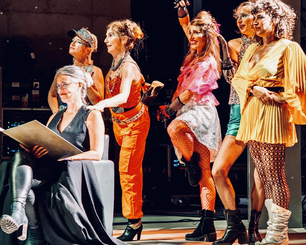 Dancing Queens réunit deux mondes a priori sans aucun rapport : la philosophie et le disco. Il s’agit d’une performance musicale, chantée et dansée : où le show disco est relevé d’interventions philosophiques – et réciproquement. Six femmes sur scène. D’une part la philosophe, de noir vêtue, majestueuse, assise dans son siège et qui expose depuis un grand livre ses réflexions concernant « nos liens ». D’autre part, les love-girls, cinq femmes avec vêtements flashy à paillettes qui s’emparent des tubes disco pour chanter, danser, célébrer la vie, la fête, l’amour et le plaisir. Un lien inattendu et explosif se produit entre une pensée aussi riche que grave, créative et profonde, voire tragique, et une musique incarnée, pétillante, décalée et … so sexy. Very philosophical dancing queens…
